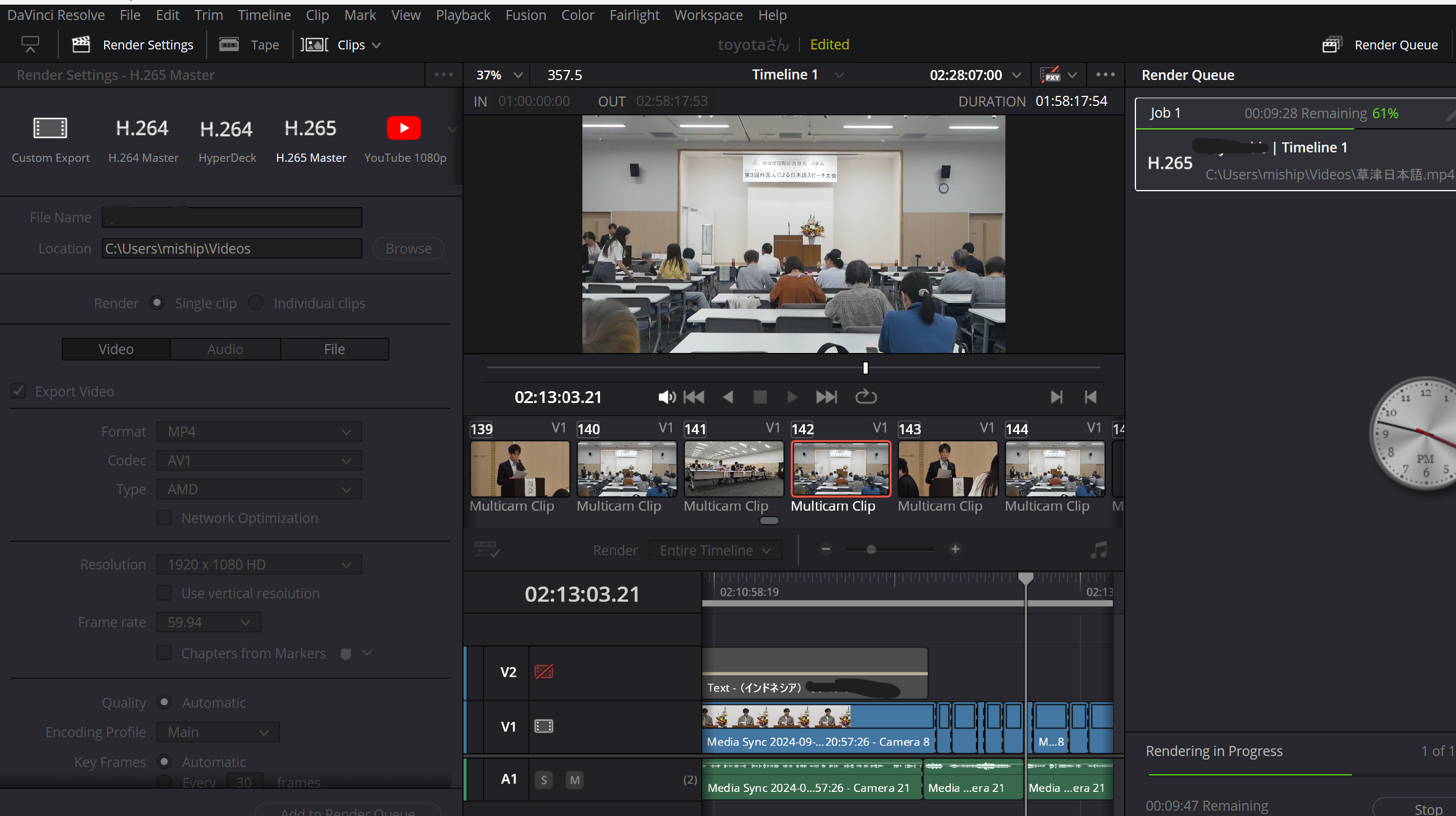 便利なツール、手段 FHD 4カメ 2時間の映像レンダリングが20分 Author mishita Date 2024年10月1日 AV1レンダリングで 映像は本当に扱いやすくなった 何度も書いているように思いますが、1/6に短縮できたように、レンダリングが早くなったと言うことは試行錯誤が出来るようになったと言うこと。 しかもレンダリング作業はすべて