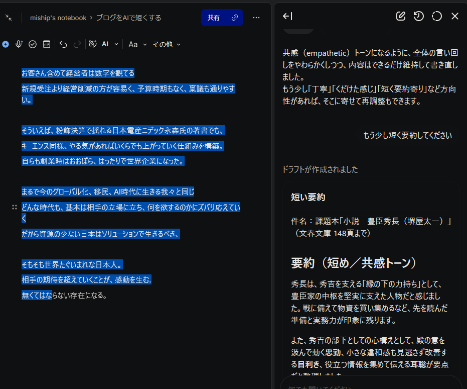 便利なツール、手段 AI で1250文字を 500文字にしたり 自由自在...だけれど... Author mishita Date 2026年3月29日 今回の京都勉強会 課題本を題材にAIで処理してみる 論語が終ったので、今回からは堺屋太一の 豊臣秀長 がテーマになりました。 まだ序盤ですが 秀長の凄さがぎっしり詰まった内容で、なぜこんなに露出がないのに 不思議だと思い