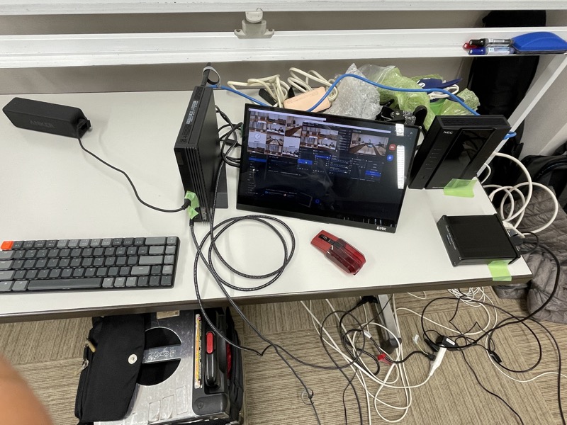 会議室に並んだ機材を眺めて思うのは、カメラやケーブルがぎっしりと詰まった場合は、仰々しい絵になりがちですが、床がケーブルだらけになっておらず、操作卓も爽やかかつシンプルな構成で組み立てられること、スマホがワイヤレスだから、10m以上離しても使えること含めて、よりシンプルだけど高度な表現の方に注力できる時代の訪れを、いち早くビジネスに投入し、実感しています。