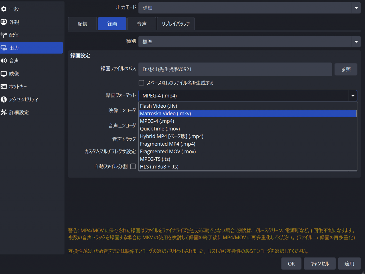 OBSの収録で、録画フォーマットをMatroska Video(.mkv)にし,映像エンコーダーをAV1にしていたので、救われました。もしMP4のままだったらすべて台無しでした。