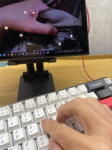 あとは、肩がこらないように、画面を上の方に、視点を移すための台座にPCを乗っけつつ、外付けキーボードは傾けてIとOを押しやすい角度にすると、あっという間に終わっていきます。