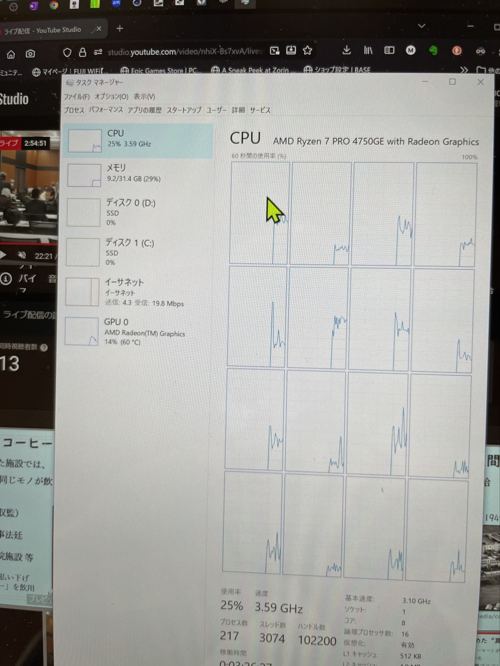 ということで、配信デスクトップのCPU負荷も2割程度と、凪の状態で配信が出来た次第です、
