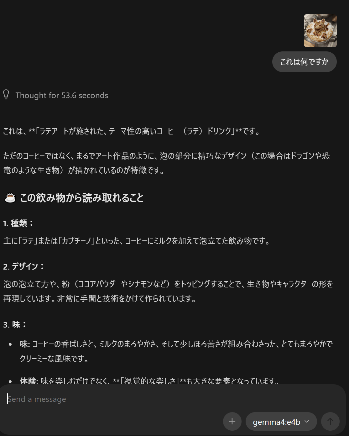 今日アップされたばかりのGoogleのローカルAIエンジン、gemma4 ジェマ4が出ていたので、Ollamaの母体ともども喫茶店でアップデートして、思わずオフラインローカルパソコン上で、このイメージ画像を解析させたら、抜群の表現力、ボキャブラリーを持つ高性能だったので、こちらも腰抜けしそうになりました。