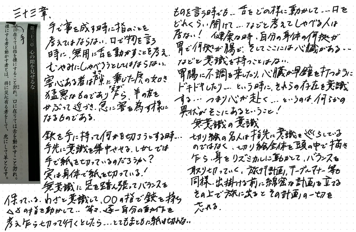 切り絵の名人は指先に意識を巡らせてはいない。頭の中で全体を描き、身をリズミカルに動かしてバランスを取って切ってゆく。