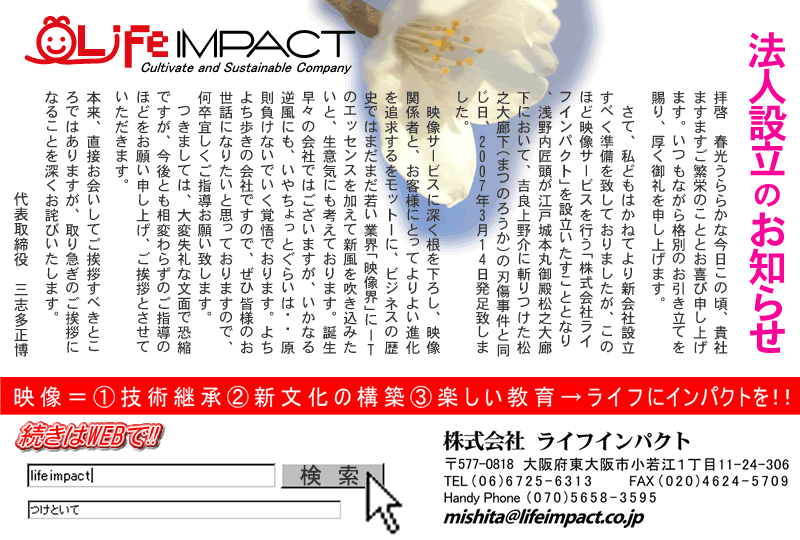 設立趣意 セールスエンジニアとして、メーカー系システム会社に就職。幸いなことに年商100億強の企業約200社のコンピューター部門を10年に渡り、営業、SEとして経験させて頂きました。マルチベンダー、オープンシステムが始まろうとしている時代、まだ一部上場企業でもLANってなあに?メールって何が出来るの?という時代に、まだ当時は小さかったオラクルや、ノベルといった企業にお声がけして、ソフト貸出しや人を出してもらい、いっしょに新しいものを提案しましょうのソリューション提案をしていました。 2002年、メールの添付ファイルに写真がつくと知り、衝撃が走りました。映像がのっかるようになれば世の中変わる。今しかない と考え、新しいもの好きで仕事は面白かったものの、6ヶ月の引継ぎ期間を経て、同社を退職しました。32歳の夏でした。 その後は、VPの現場やコンサートなど、プロ現場を体験しながら全国ビデオカメラマンのアイデアを思いつき、仲間を集めていきました。 あるセミナーで知り合った人と映像・写真関連の会社を設立しました。この中でプロデューサー、ディレクター、カメラマンとして、いろんな映像制作に関わり、映像のおもしろさと可能性を感じました。と同時にそれを作り上げるスタッフや関係者を取り巻く環境についての問題点 より映像サービスに深く根を下ろし、映像関係者と、お客様にとって よりよい進化を求めるべく独立を決意しました。 そして2度目の法人を興す前に改めて、やってきたことをフカンで眺め、映像がやれること、やるべきことははたしてなんだろうを真剣に考えました。 思い出したのは、ある感動シリーズの講演のビデオ記録の仕事でした。美容院向けの講演だったものの、第8回もの全国から感動満載実在ストーリーは、不覚ながら撮影しながら涙を流してしまいました。多くの人に伝えるべく、このビデオは主催者に許可を頂き、感動セミナーのビデオ販売をさせて頂いています。 まさにこれからは顧客に心底寄り添ったサービスが主体になると確信。 考えて出た答えは、人や生活に対する「残す」「伝える」「楽しく」でした。 そこにiPhoneやタブレットなどの携帯機器や、インターネット技術を用いた低価格の遠隔生中継、全国カメラマンネットワークによる素材交換の仕組みなど、数々のIT技術革新+αのエキスを加えることで、今までにない新しい文化が生まれるのではないかと。 そういった耕して循環し、やがて文化になるという意味をこめて英語で、Cultivate そして社会貢献や、関係者の地位向上を目指せることを信じ、ライフにインパクト をかかげて「株式会社ライフインパクト」を設立致しました。